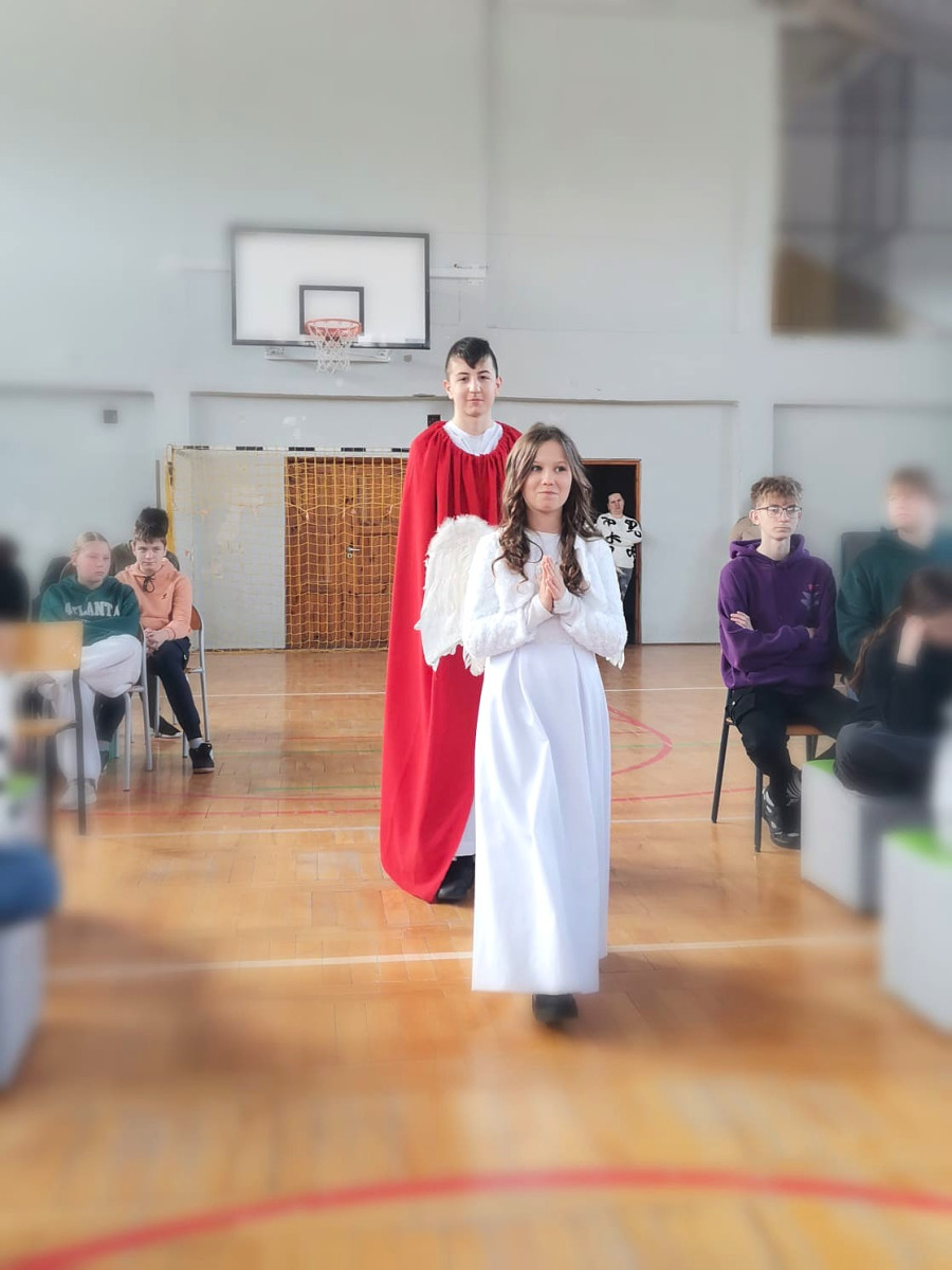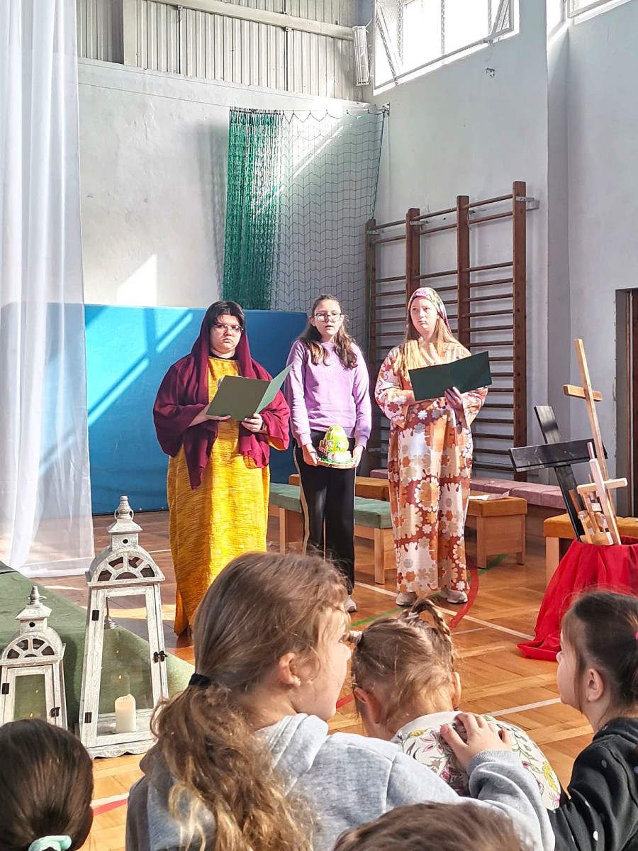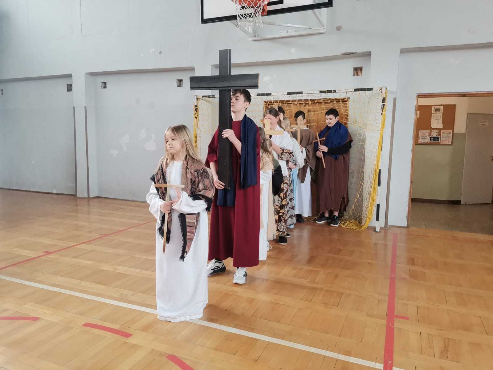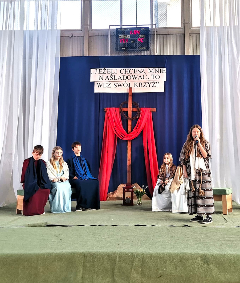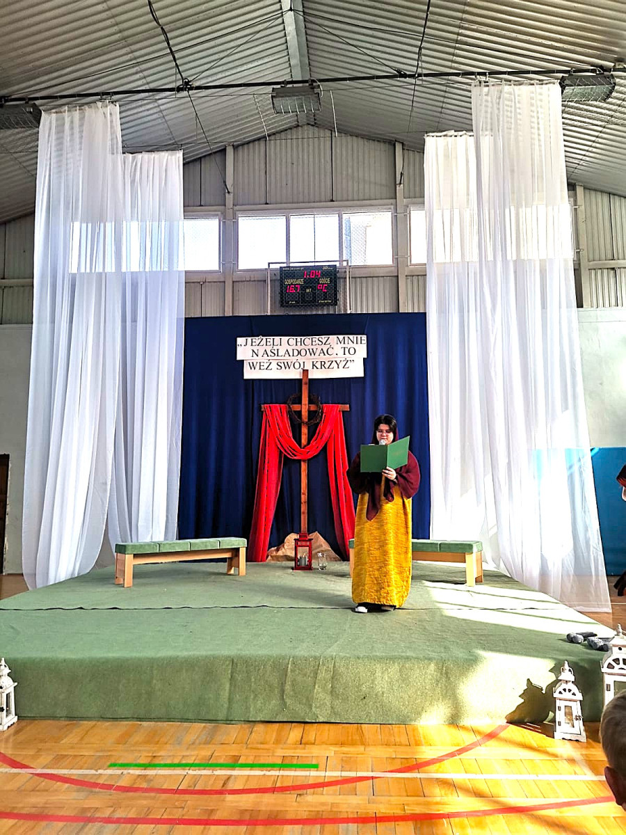 Uczniowie naszej szkoły w niezwykle poruszający sposób przedstawili historię męki, śmierci i zmartwychwstania Jezusa Chrystusa. W przedstawieniu nie zabrakło scen biblijnych, refleksyjnych tekstów oraz wspólnego śpiewu, które wprowadziły wszystkich w atmosferę zadumy i nadziei.