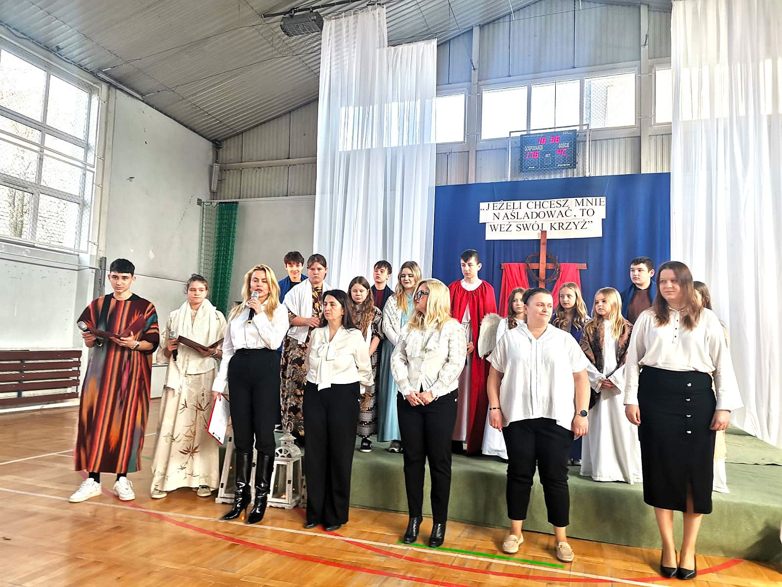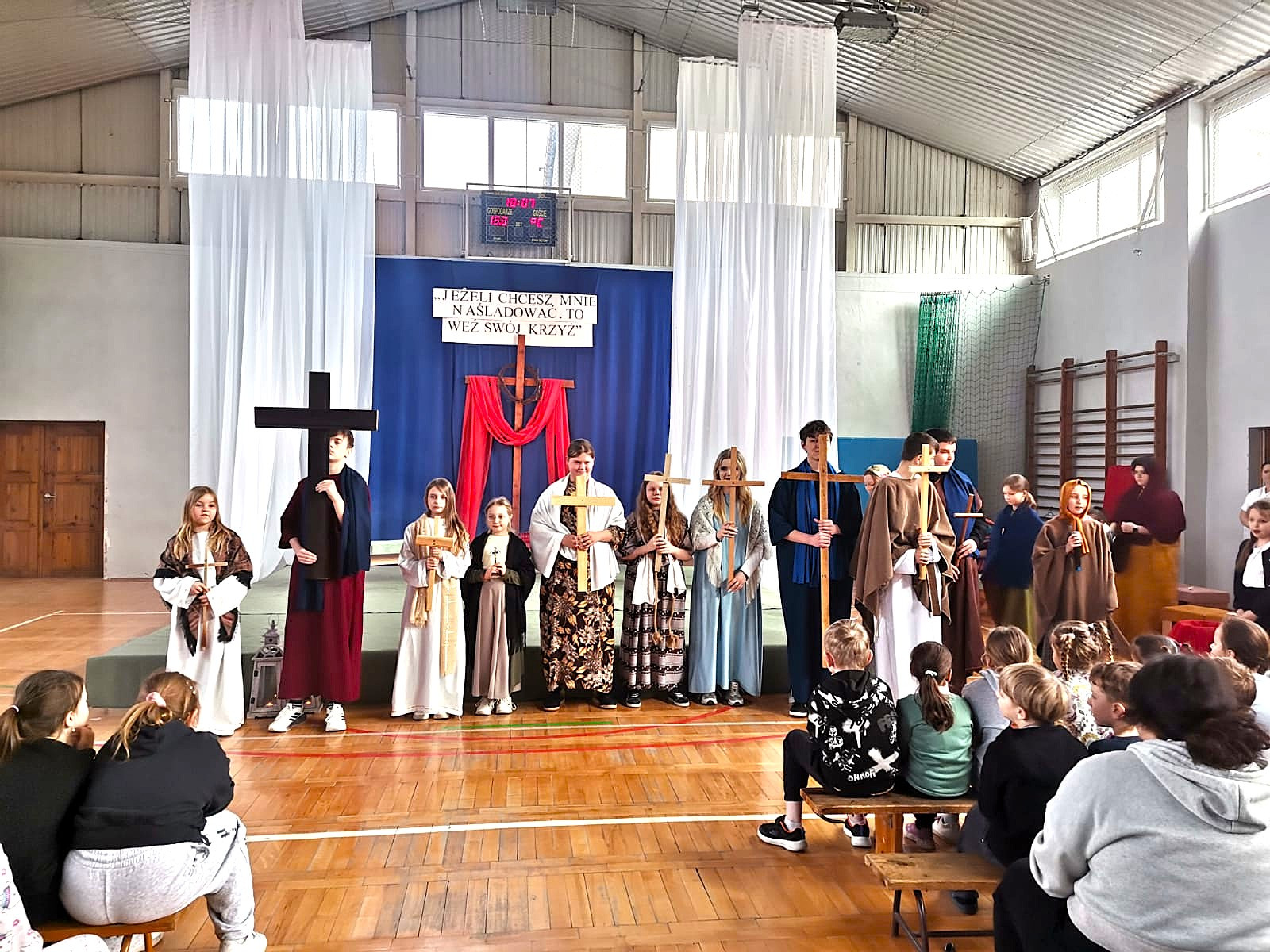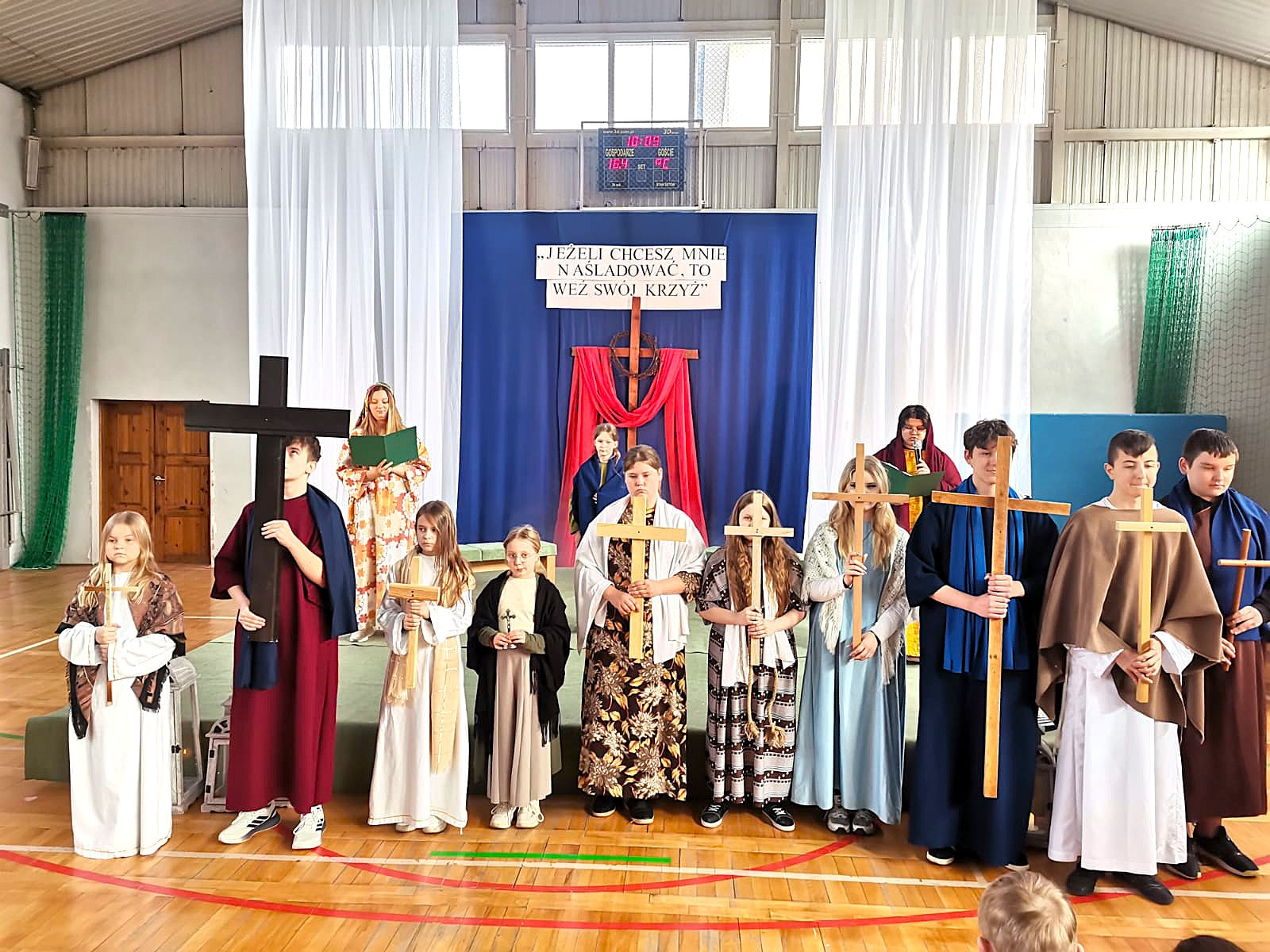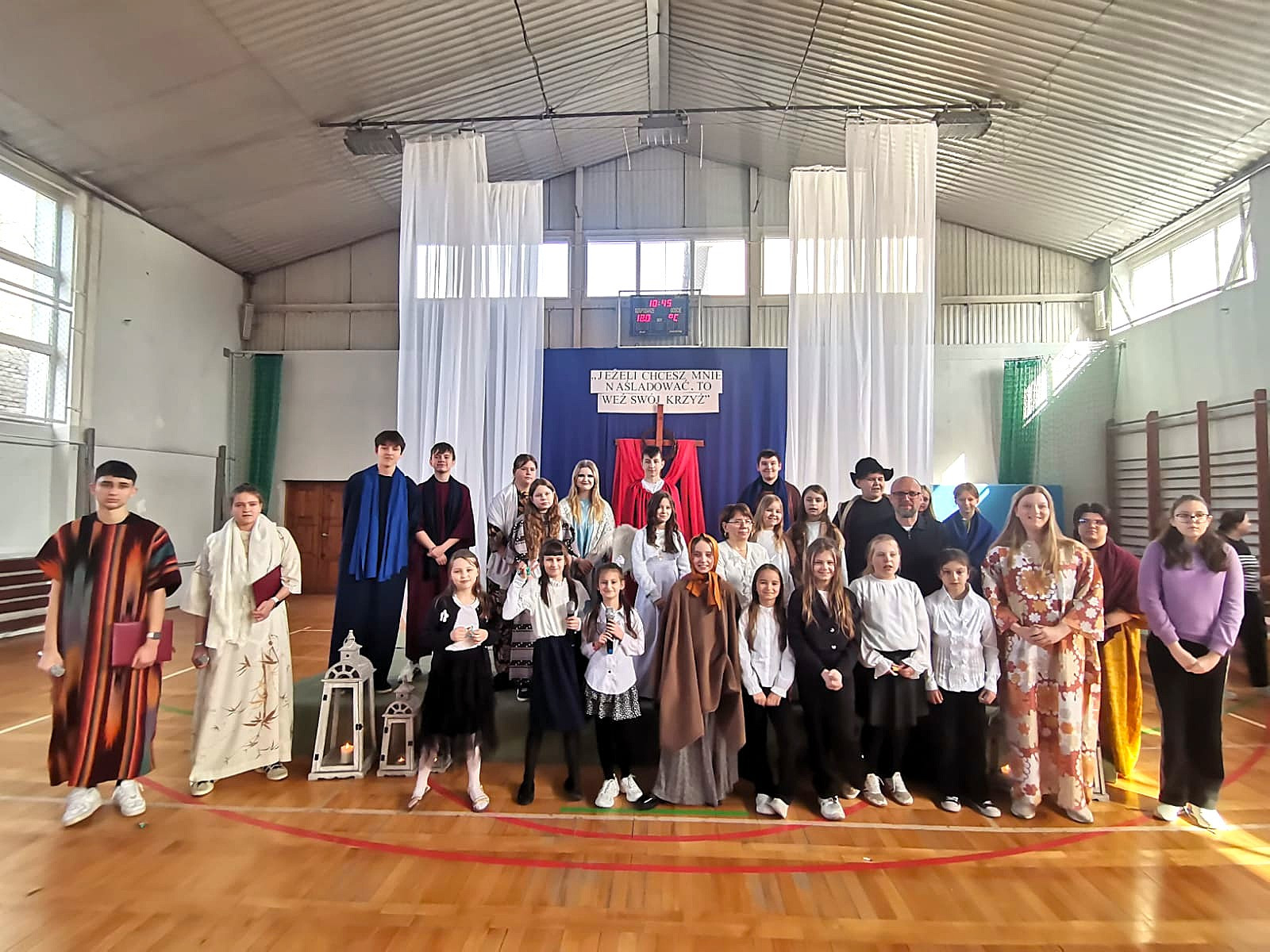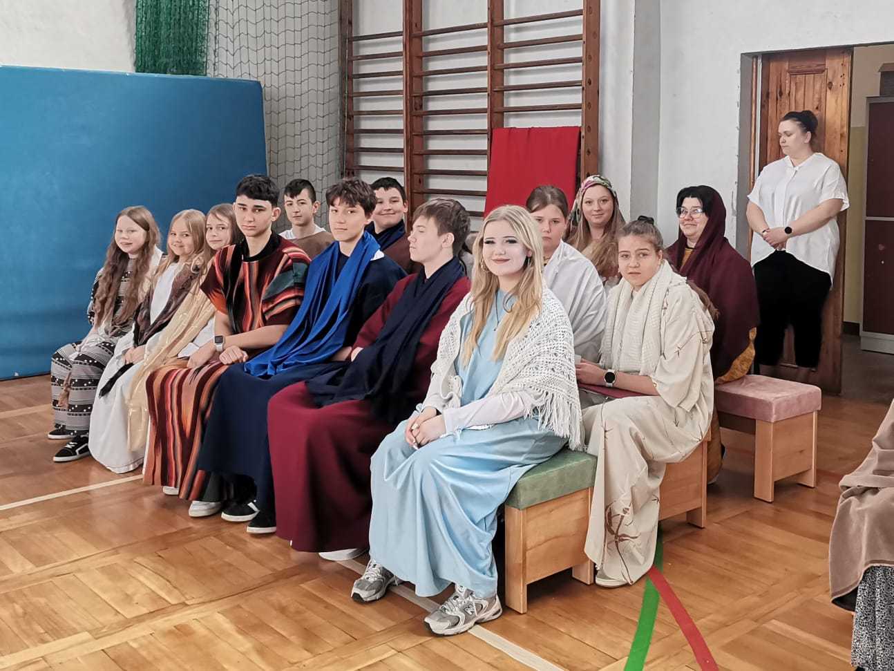 Uczniowie naszej szkoły w niezwykle poruszający sposób przedstawili historię męki, śmierci i zmartwychwstania Jezusa Chrystusa. W przedstawieniu nie zabrakło scen biblijnych, refleksyjnych tekstów oraz wspólnego śpiewu, które wprowadziły wszystkich w atmosferę zadumy i nadziei.