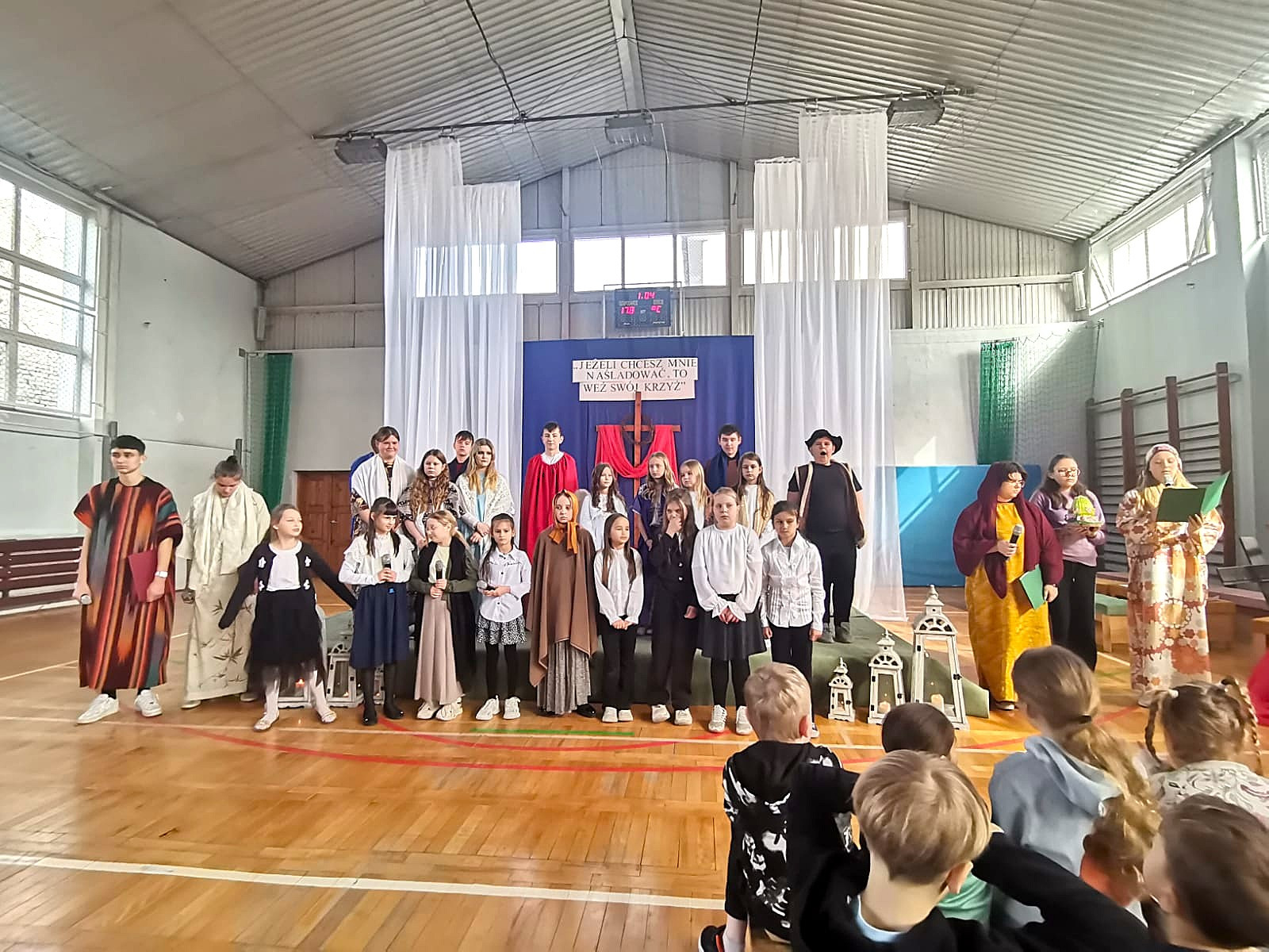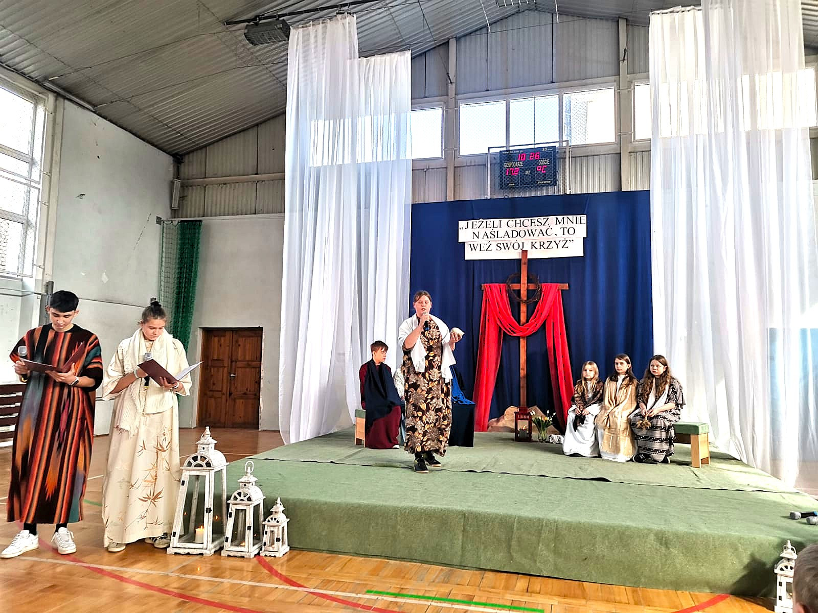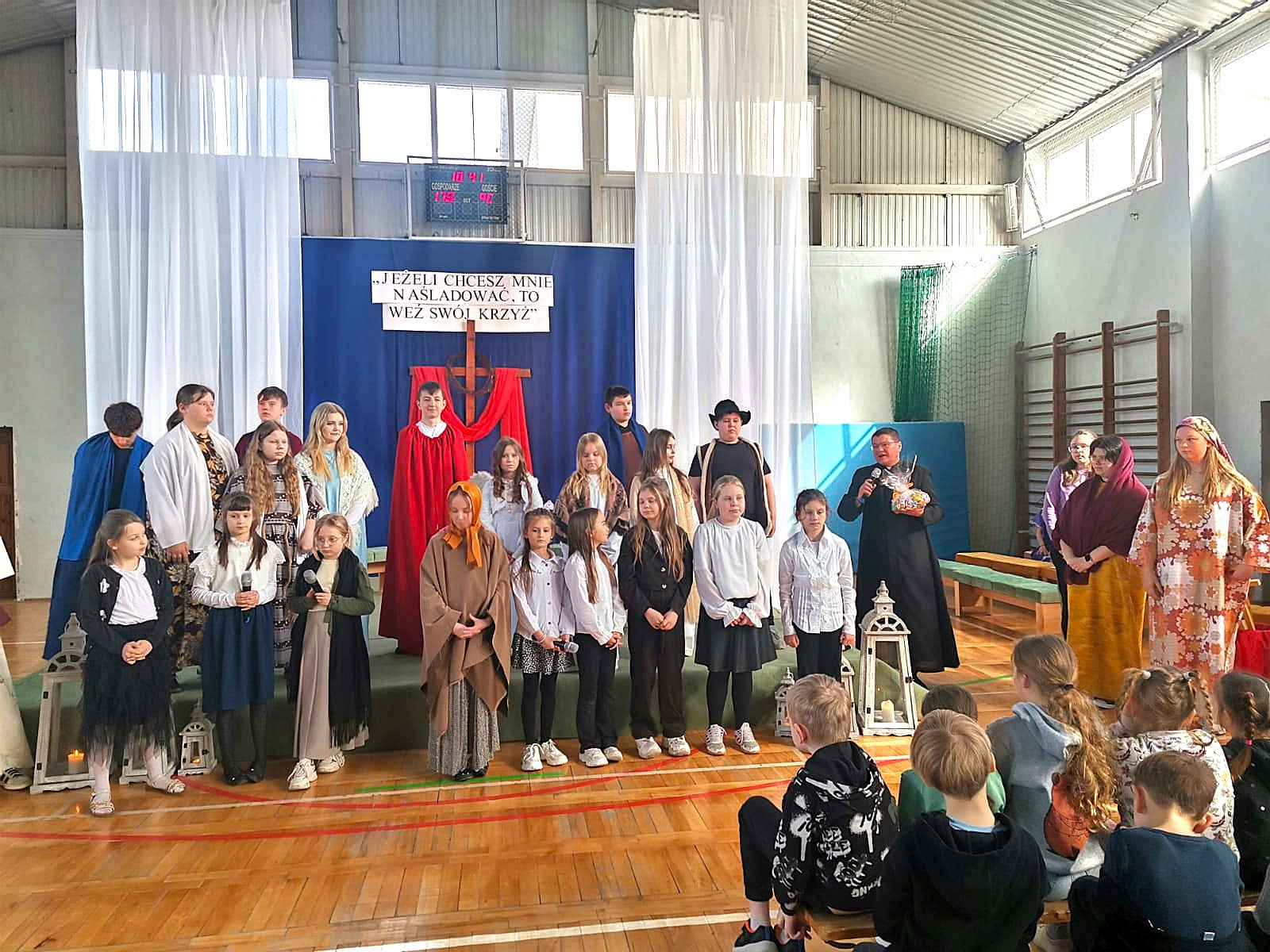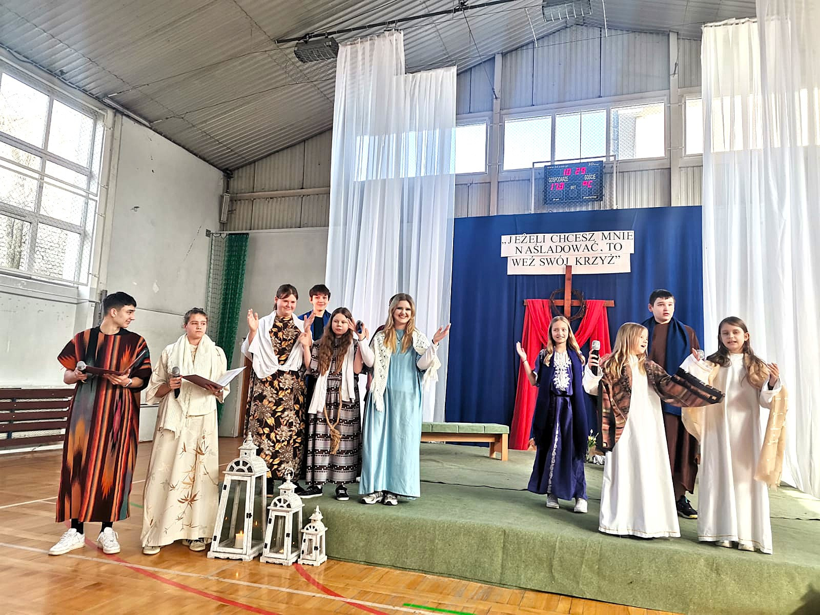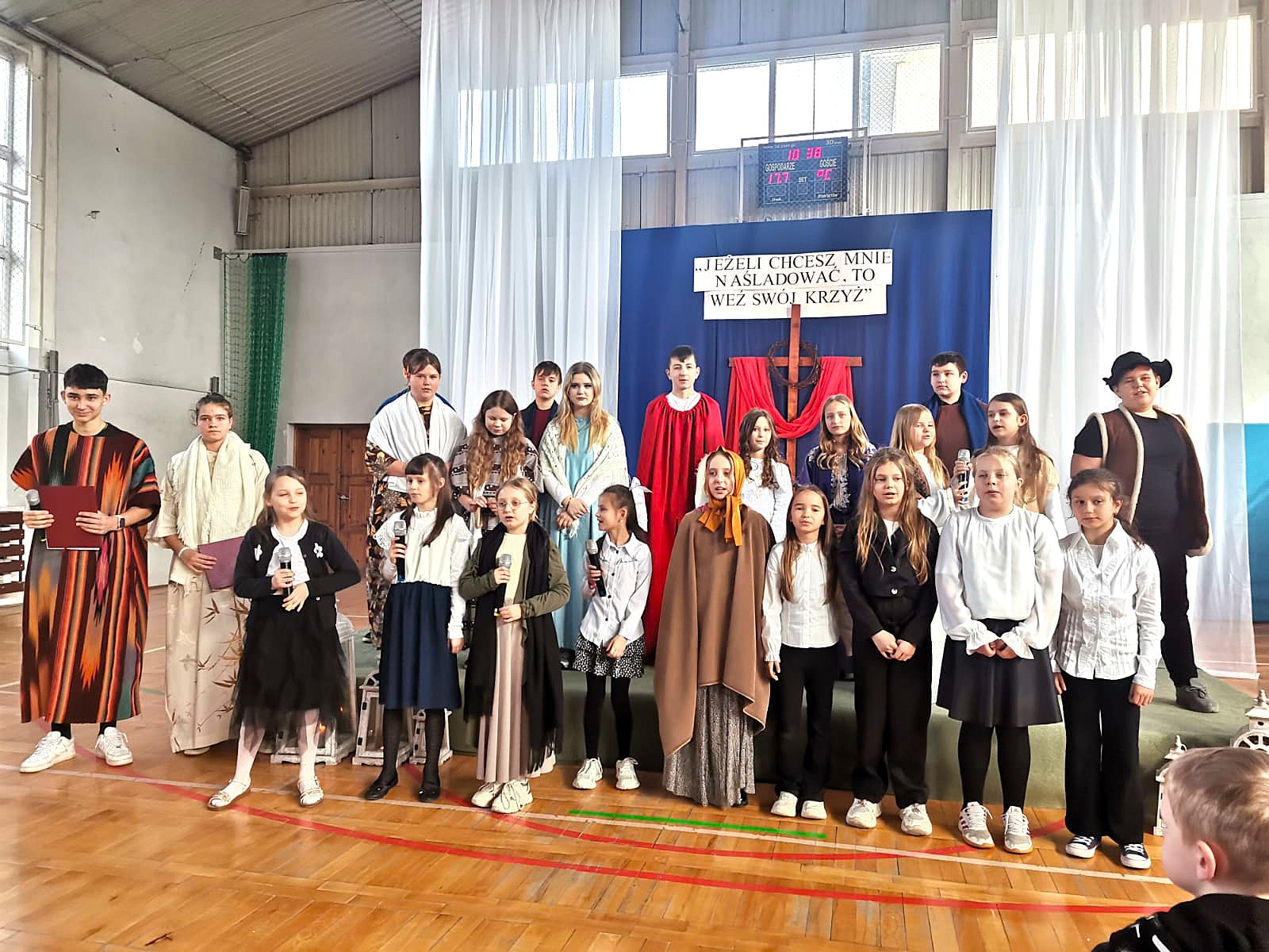 Uczniowie naszej szkoły w niezwykle poruszający sposób przedstawili historię męki, śmierci i zmartwychwstania Jezusa Chrystusa. W przedstawieniu nie zabrakło scen biblijnych, refleksyjnych tekstów oraz wspólnego śpiewu, które wprowadziły wszystkich w atmosferę zadumy i nadziei.