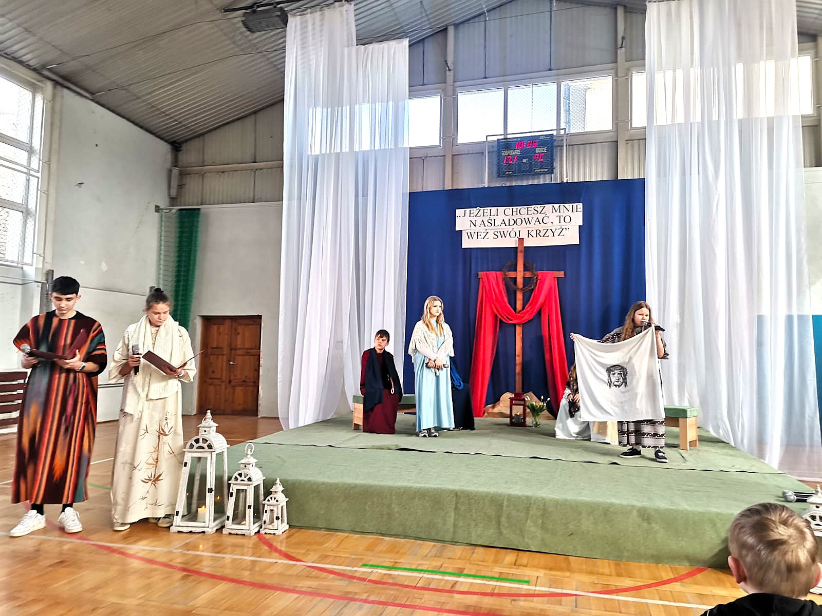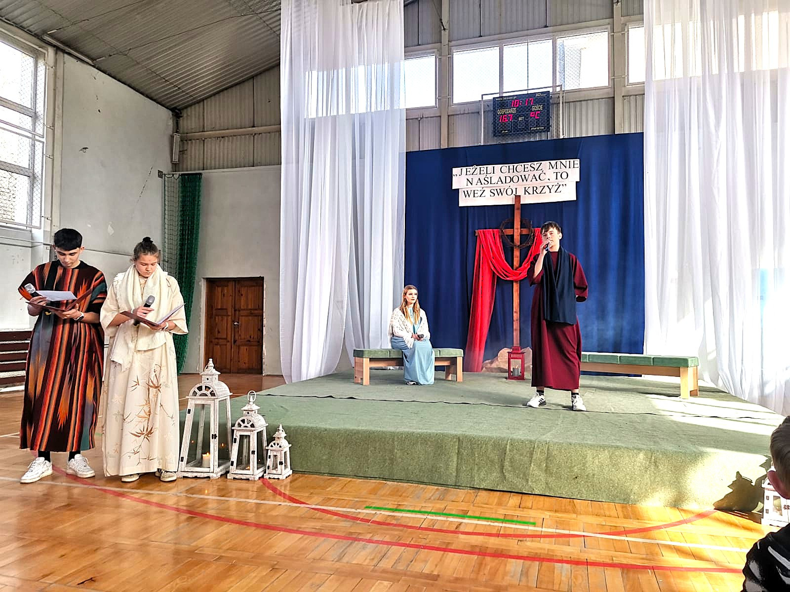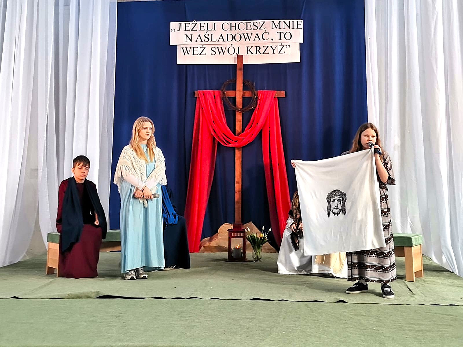 Młodzi aktorzy wcielili się w postacie znane z Ewangelii – m.in. Piotra, Zacheusza, ślepca z Betsaidy czy Matki Bożej. Dzięki ich zaangażowaniu i wrażliwości mogliśmy wspólnie przeżyć piękne i głębokie chwile przypominające o sensie Wielkanocy.