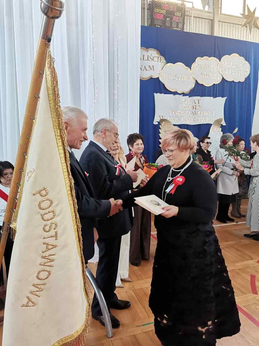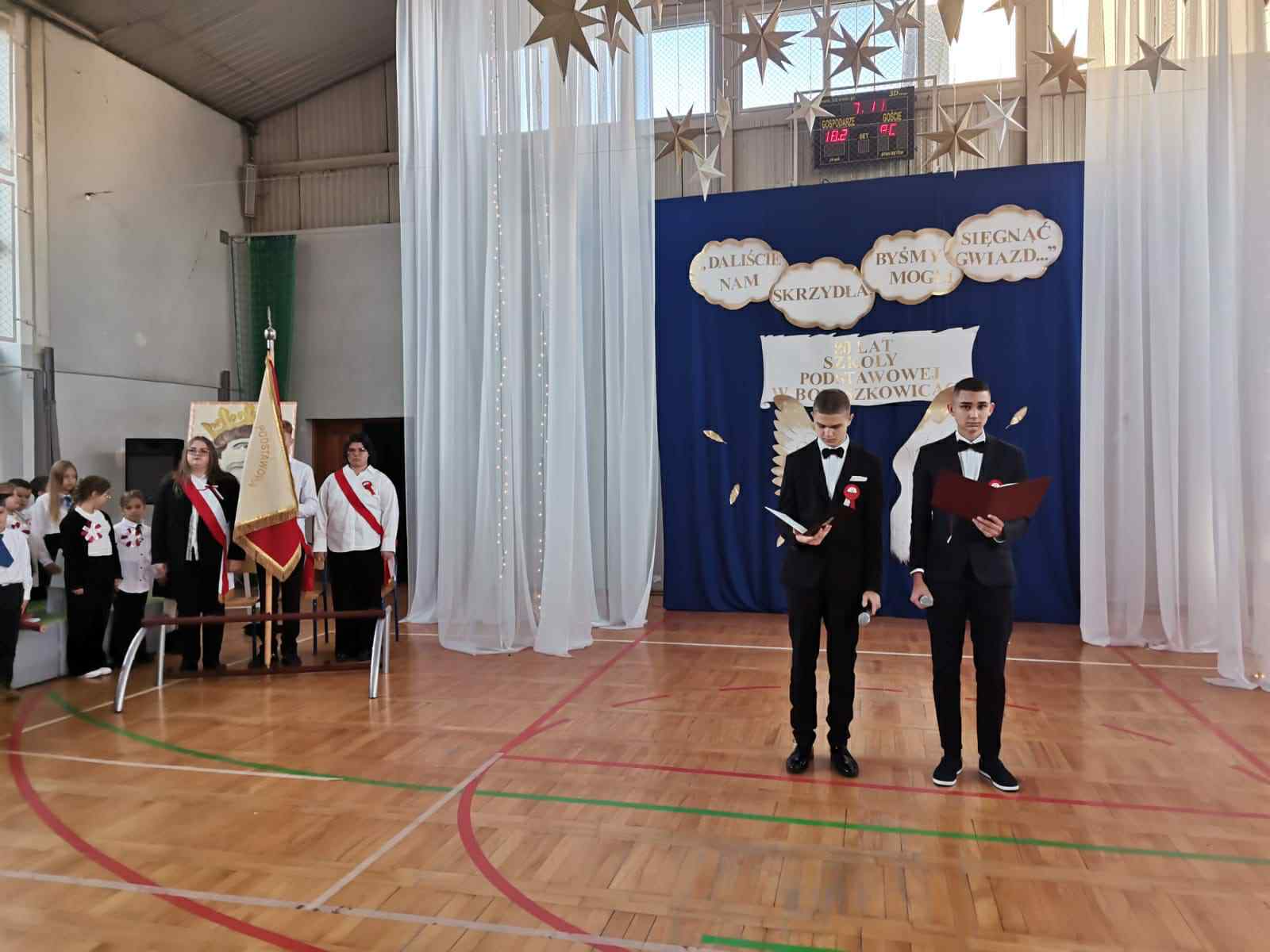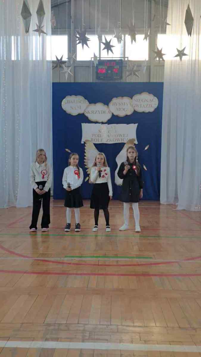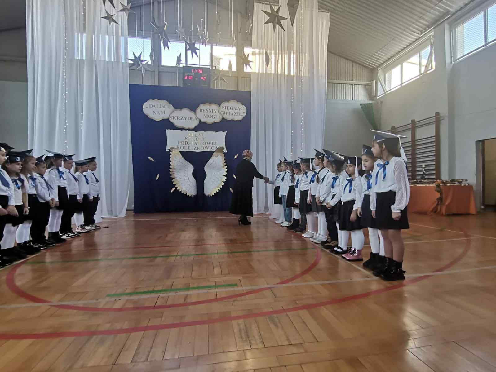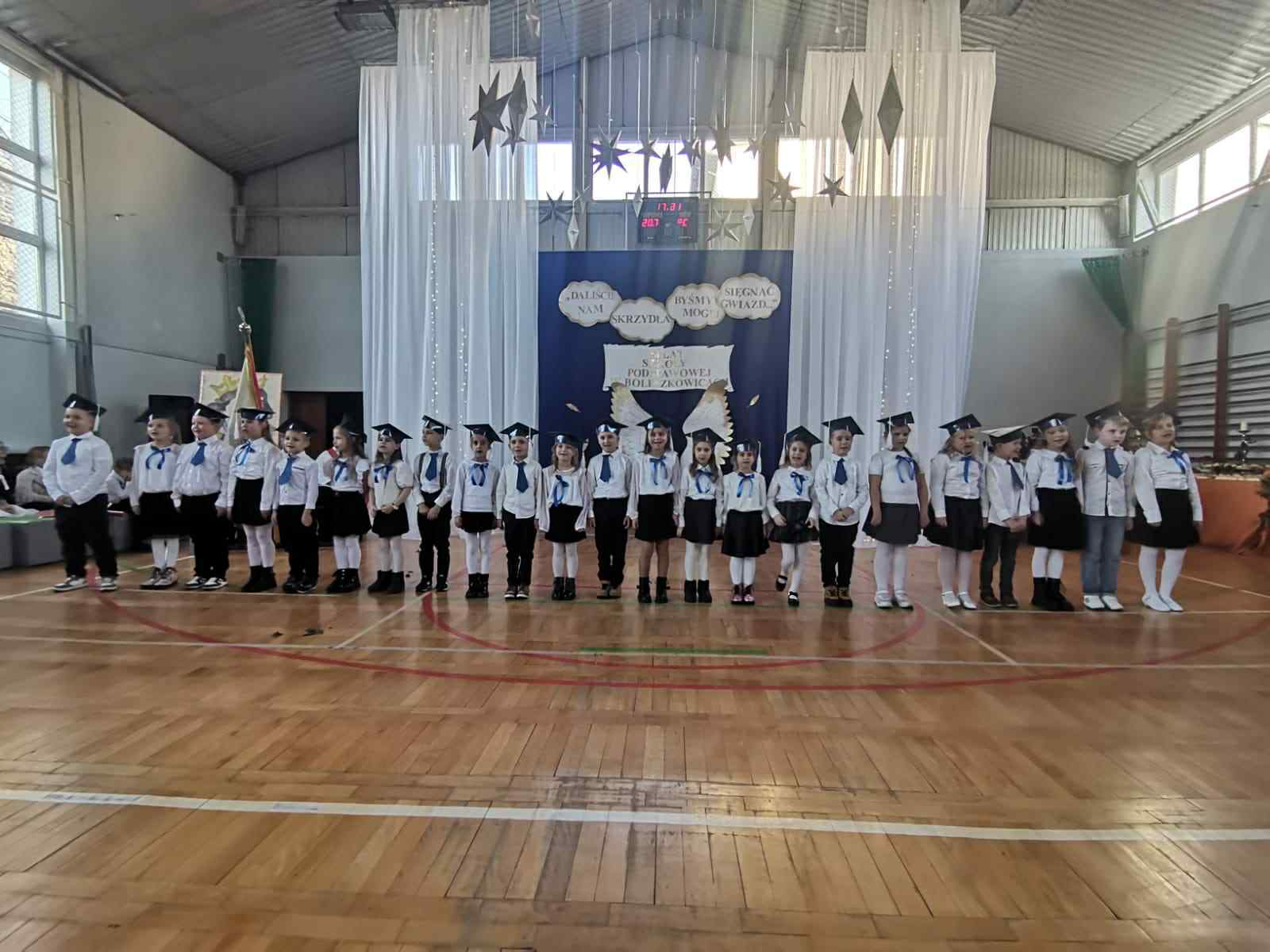W wyjątkowym momencie pan Edmund Zioła, autor słów i muzyki hymnu szkoły, zaśpiewał i zagrał nasz hymn. Wystąpiły także dzieci, prezentując piękny montaż słowno-muzyczny, a najmłodsi uczniowie z dumą złożyli ślubowanie i zostali pasowani na pierwszoklasistów.