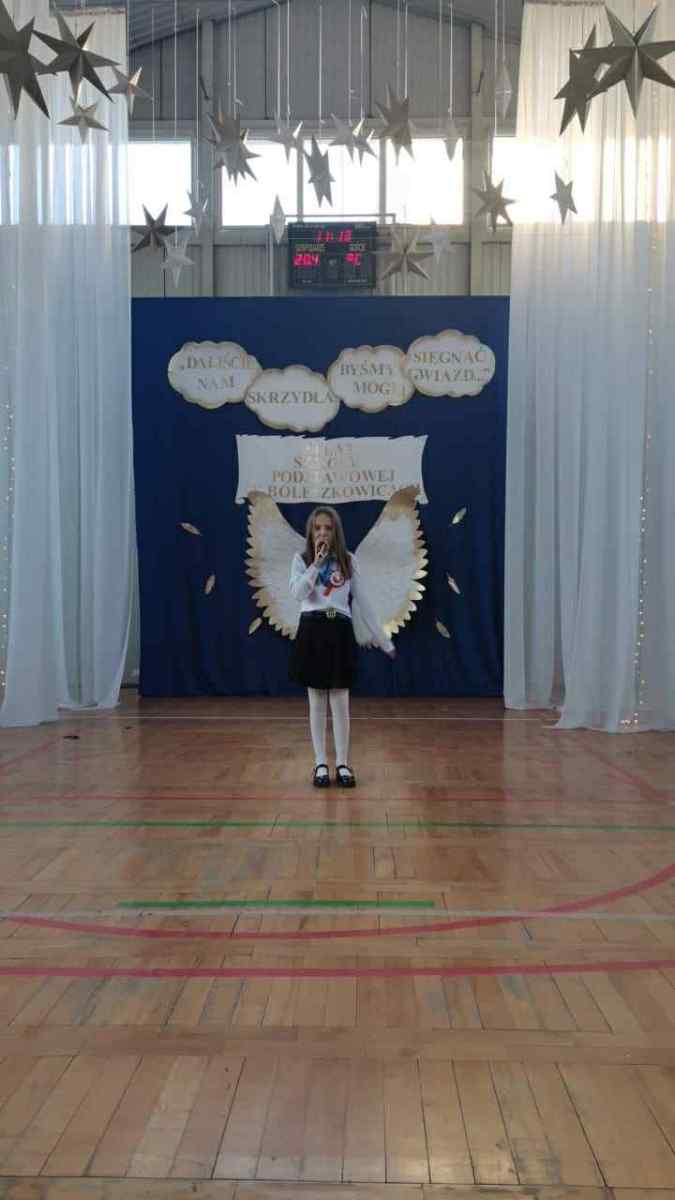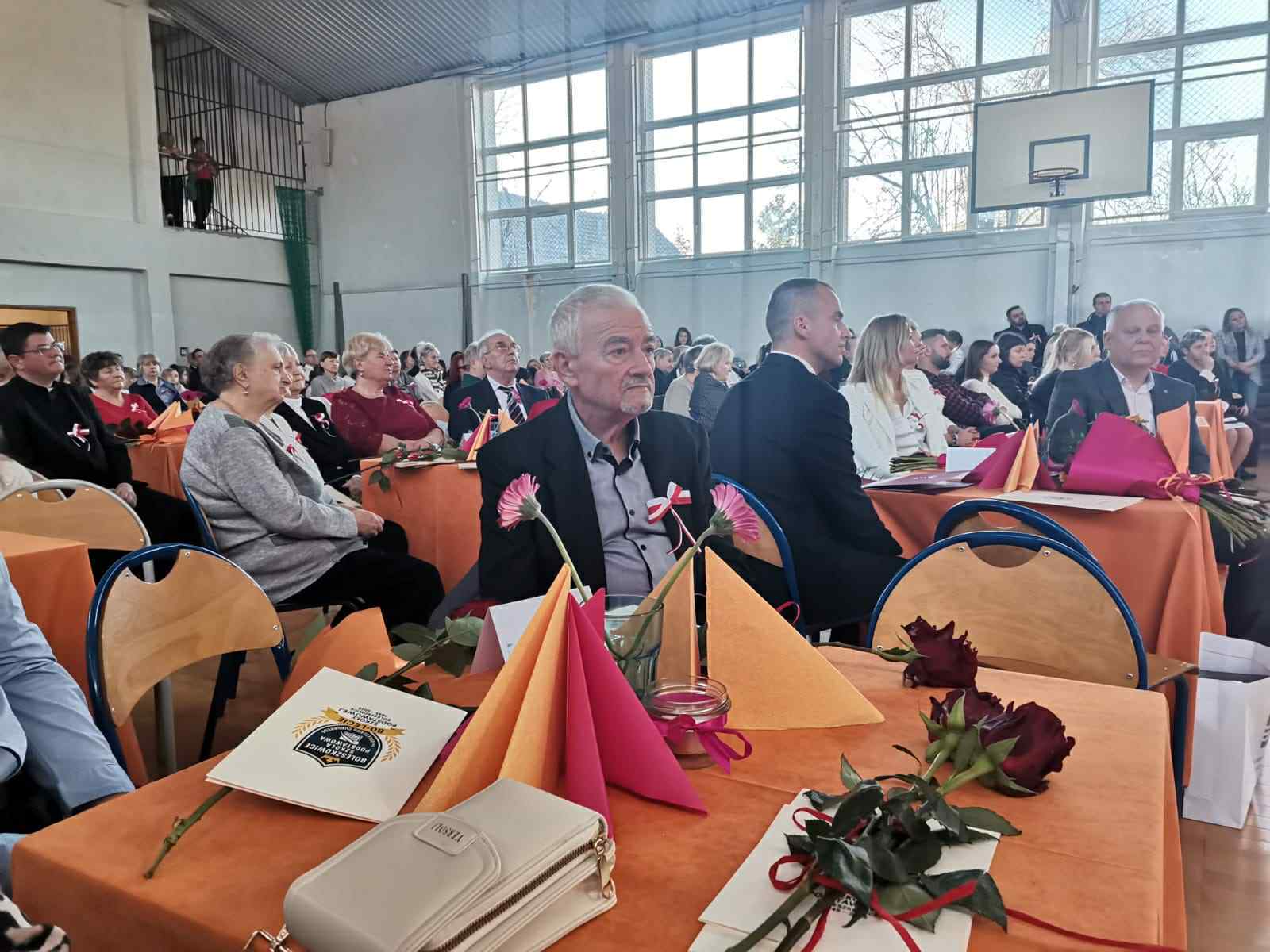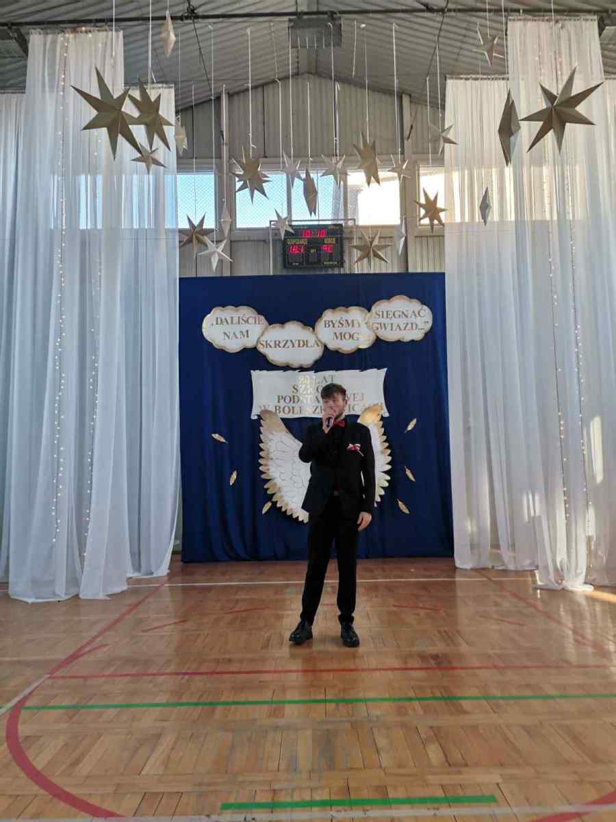 Po mszy przeszliśmy na salę gimnastyczną, gdzie odbyła się główna część obchodów jubileuszu. Uroczystość otworzył występ naszego absolwenta, Bartosza Żugaja, który wprowadził wszystkich